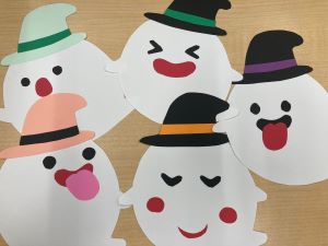 皆さんに協力していただき、おばけとかぼちゃの壁面飾りを準備していきます。