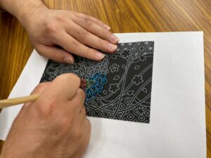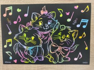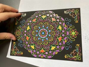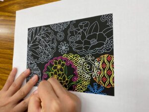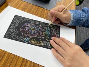 黒い面を削ると色が浮かび上がるこのアートは、手を動かしながら集中できるのが特徴です。